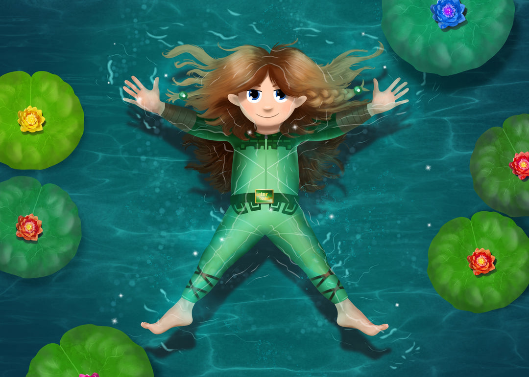 Have you already met Sculli, member of The Swimvincibles? A really positive spirit, when Sculli's not thinking about how to improve children's core aquatic skills, she's making things from the pieces of driftwood she's found in and around Floating Forest, her island home. Always floating around looking for someone to help, she's never happier than when she's surrounded by nature. She's always motivating everyone by saying, "Push and glide, now smile with pride."