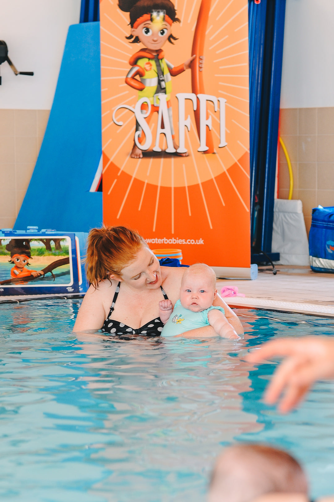 Check that the temperature of the pool is at least 32° for newborns and babies under 12 weeks or 12 pounds, and 30° for older babies.