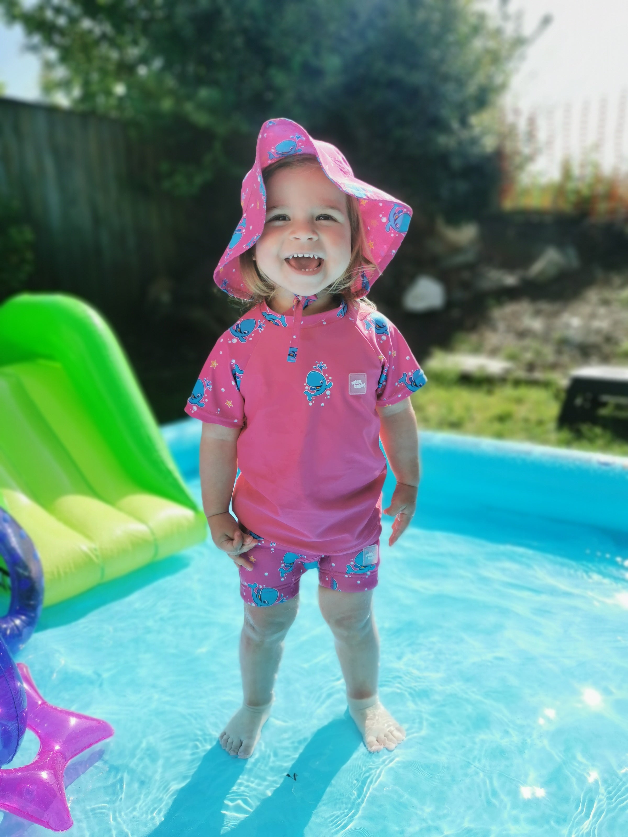 Build a summer wardrobe with your little one's safety in mind. Sun hats if you're outside, UV protective clothing such as sunsuits, or wetsuits if you're worried they might get a bit chilly; and for older toddlers, a float jacket can give them a little bit of independence (always under supervision).